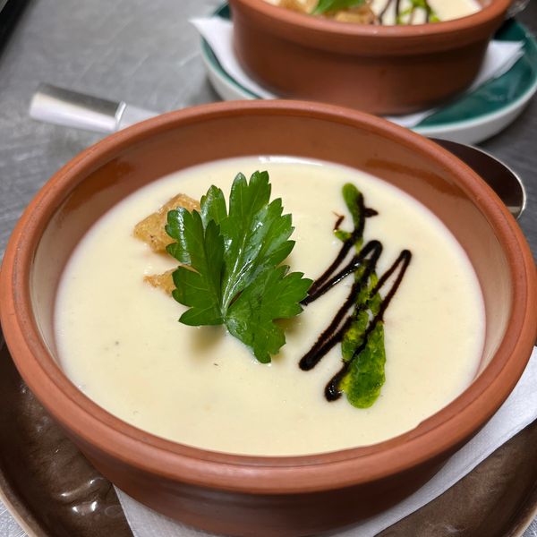 Hot Potato Soup, Cold Truffle Foam, Potato Frites